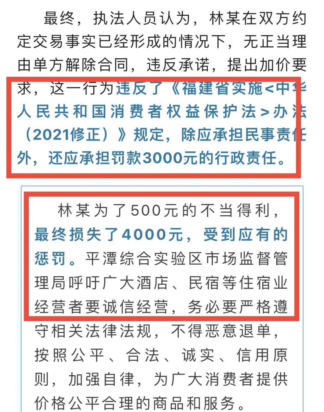 【8】遭遇民宿退款,强制取消订单游客数不胜数:案例一:(化名)杨某在2023年2月看到福建平潭一家民宿房价亲民,预定了五一假期4晚房费,然而4月上旬,民宿老板通知游客(杨某)预定房间五一假期无法入住,原因是民宿出现电源故障,要求杨某取消订单,游客杨某未同意退单,双方协商未果,民宿老板单方面强制取消l游客(杨某)订单,游客最终向当地文旅局投诉,相关部门介入调查,游客杨某情况属实,民宿商家违规毁约涨价,对民宿商家采取罚款3000元处理,赔偿游客1000元,最终因小失大,民宿老板为了多赚500元,损失啦4000元。