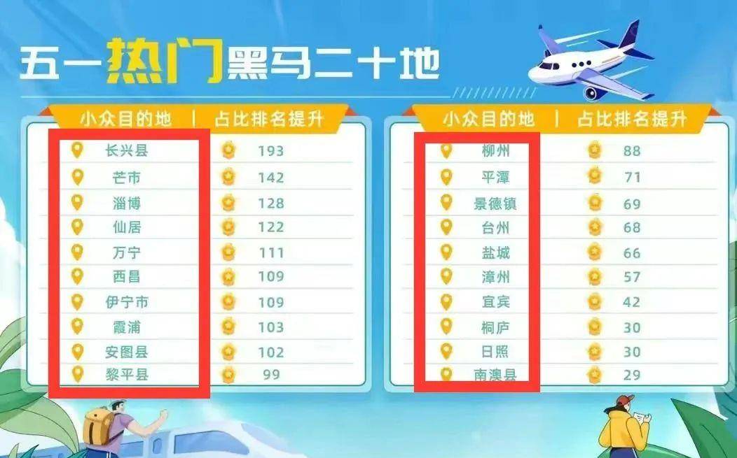 【3】20个冷门旅游地:长兴县 、柳州、芒市 、平潭、淄博 、景德镇、仙居 、台州、万宁、 盐城、西昌 、漳州、伊宁市 、宜宾、霞浦 、桐庐、安图县 、日照、黎平县 、南澳县等。