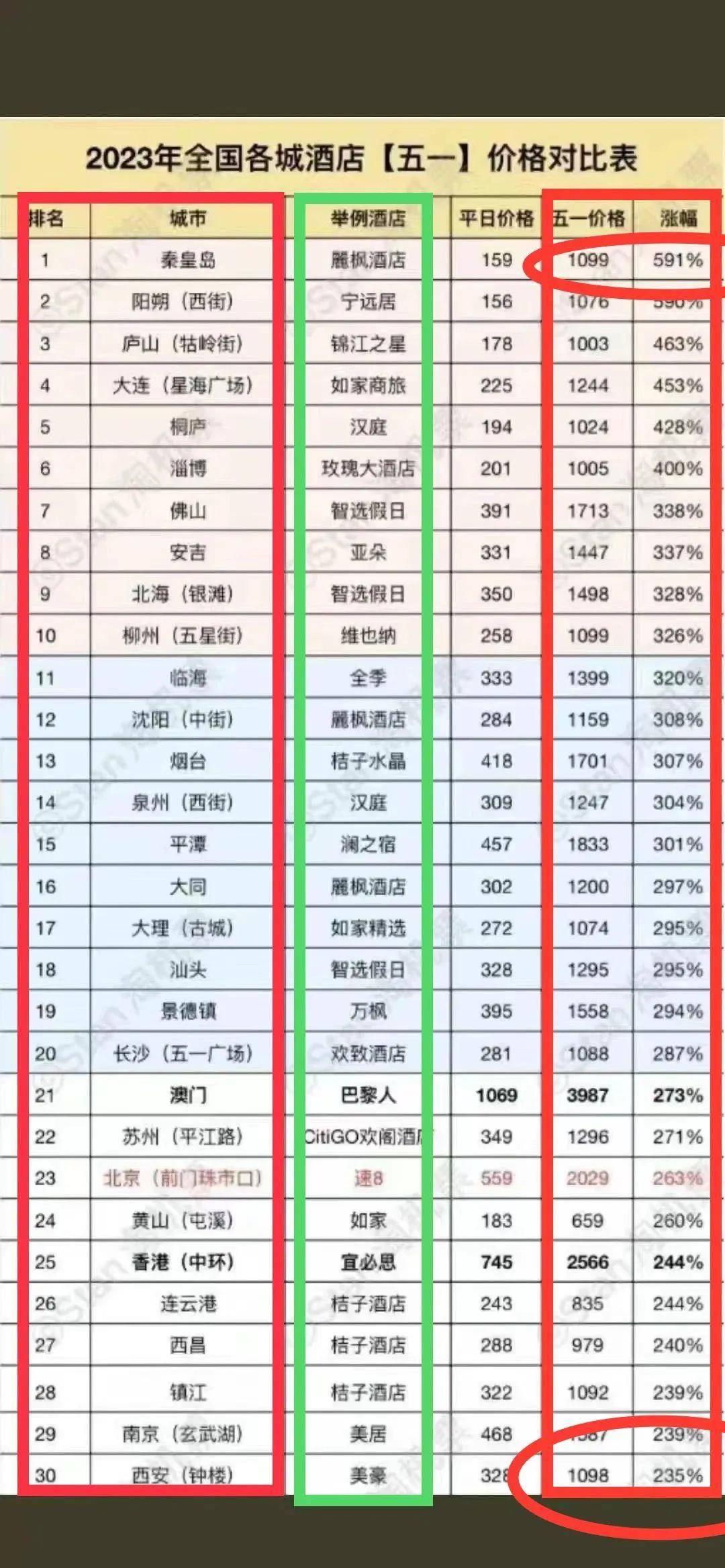 【4】这是三年疫情之后第一个五一小长假,全民出行热潮高峰达到了前所未有的高度,根据各大订房平台数据显示,全国30座城市酒店房价最高涨幅591%,最低涨幅235%,途家民宿订房平台全国10座城市订单增长14.6倍,对于中产、低产家庭选择民宿酒店游客更多,民宿有几个有点,环境好,价格亲民,小众,清净。