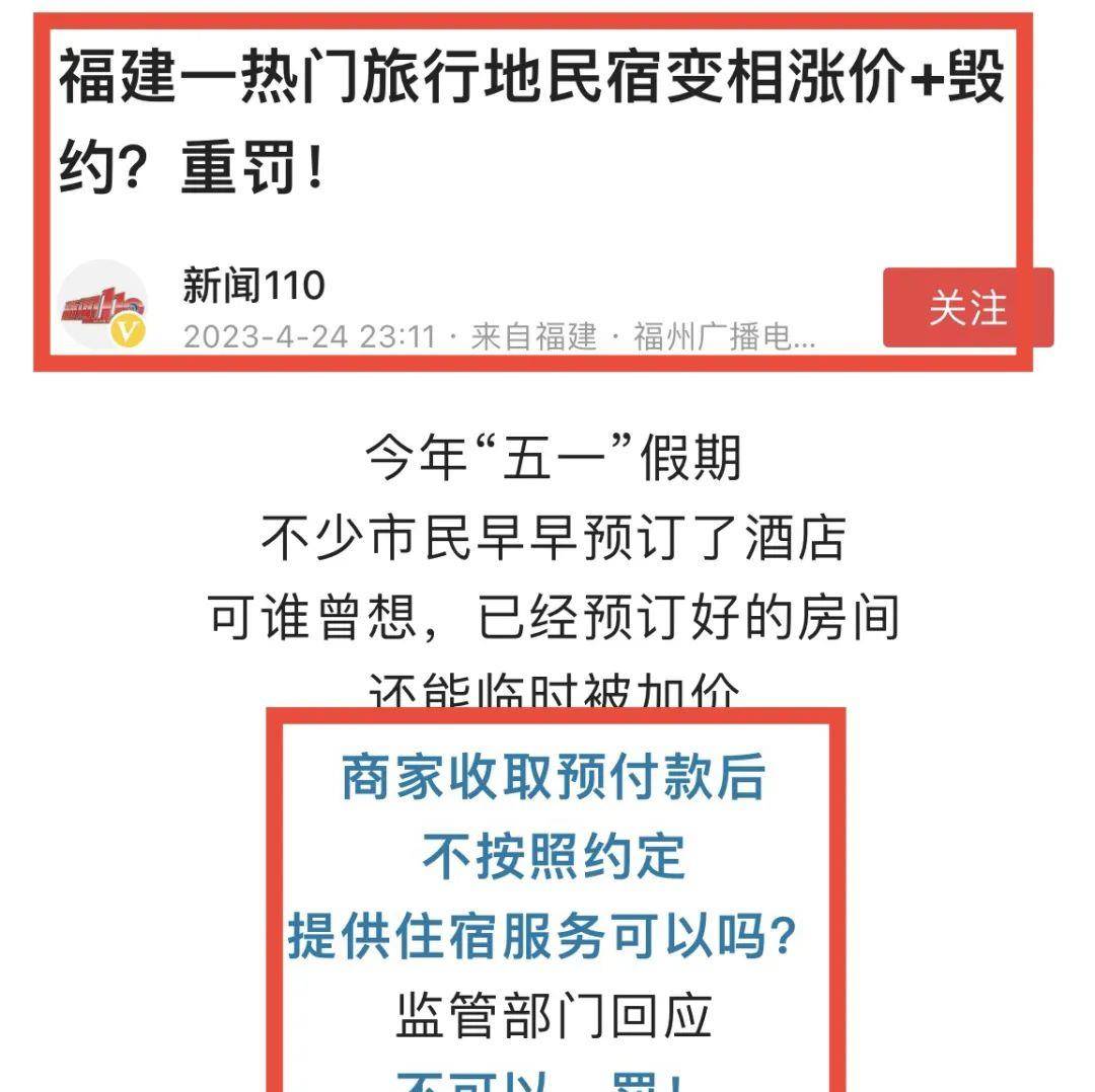 【10】案例三:浙江杭州邓女士,3月中旬预定了一家某地民宿,当时价格为(五一假期)100元一晚,3月27日,游客突然接到民宿电话,民宿在装修,五一假期无法入住,要求邓女士退单,民宿愿意提供100元代金劵补偿,邓女士通过订房平台搜索,该民宿不是在装修,也不是没房,只是房价从原来100元涨到了500多元,她明白是房东毁约啦。双方协商赔偿未达成协议,邓女士随后投诉12345热线,最终处理结果游客未与民宿签订退一赔三合同。