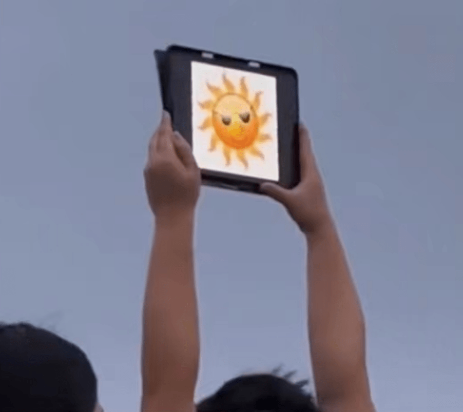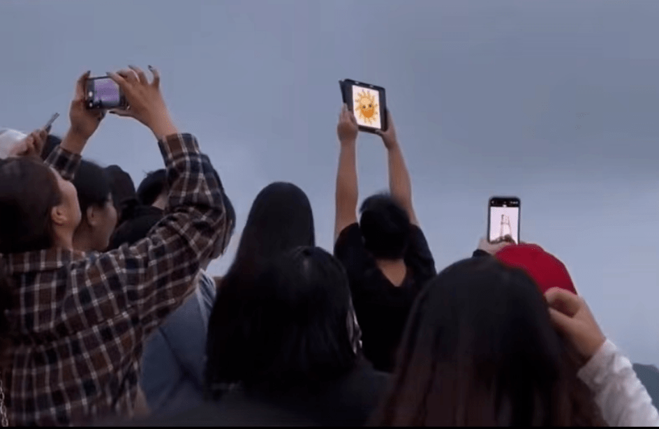 结果人群当中,有人高高举起了手机展示了一张太阳的照片,让大家看一次赛博日出。