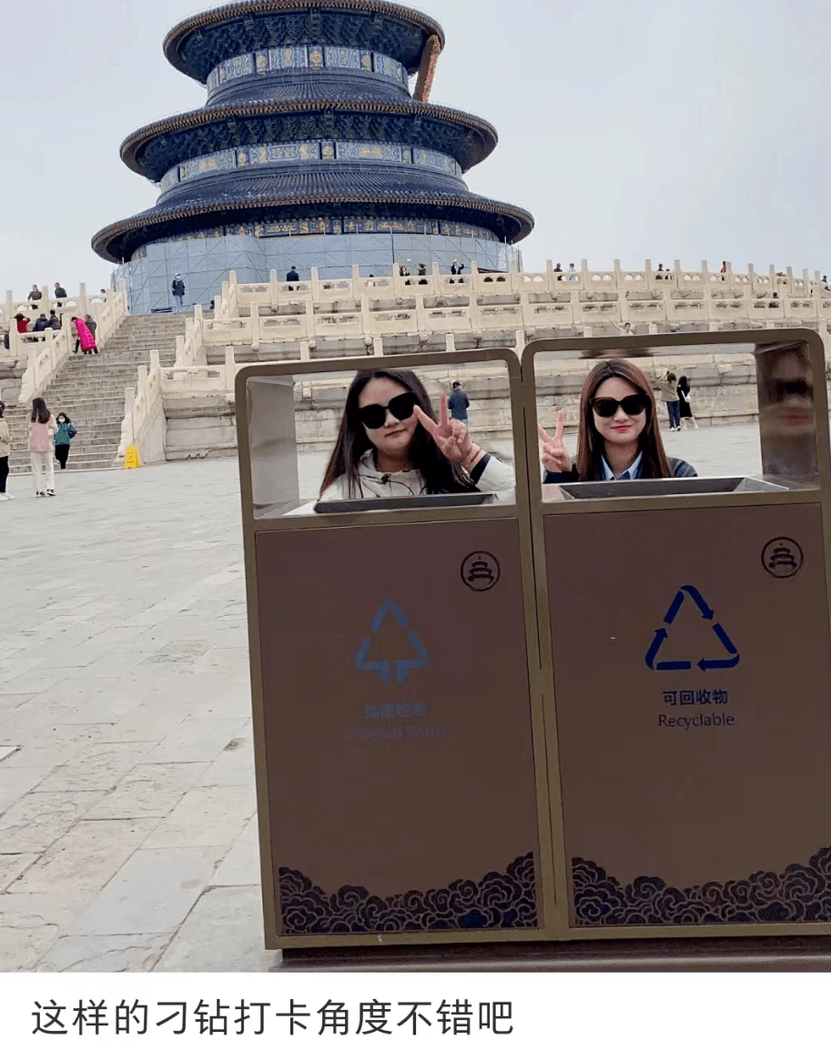 而如果你在北京天坛景区内,看到有人排着队蹲在 垃圾桶前,也不要感到慌张。