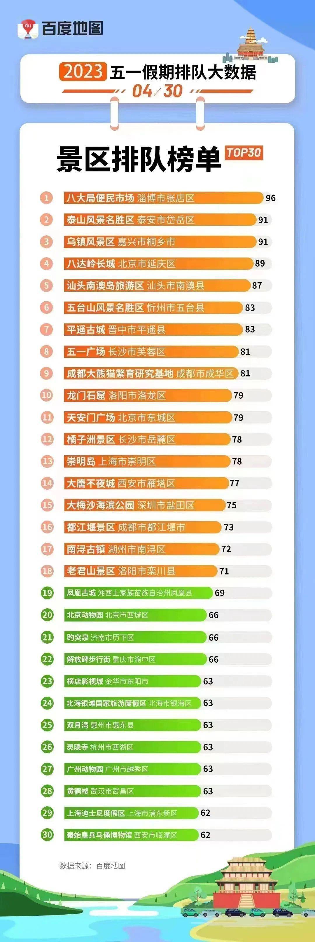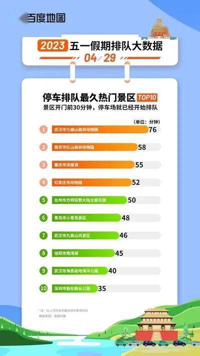 根据《百度地图五一假期排队大数据》,景区开门前30分钟,停车场已经排起长队,武汉九峰山、南京红山森林公园、重庆洪崖洞等备受自驾游喜爱,停车场排队时长排名前三,最长可达76分钟。