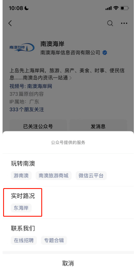 关注 【南澳海岸】公众号→点击菜单栏→实时路况,便可实时了解 “东海岸方向”的交通车流情况。