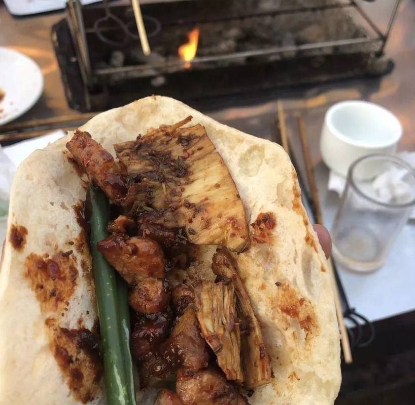 顾客桌子上会放个小型烤架,烧烤师傅先把食材烤到八分熟左右,然后把串上给顾客自己烤制,这样就可以自己选择干湿度了。淄博烧烤的小饼也是一绝,吃肉串都不用嘴直接用饼一撸就好,再加根葱简直无敌!