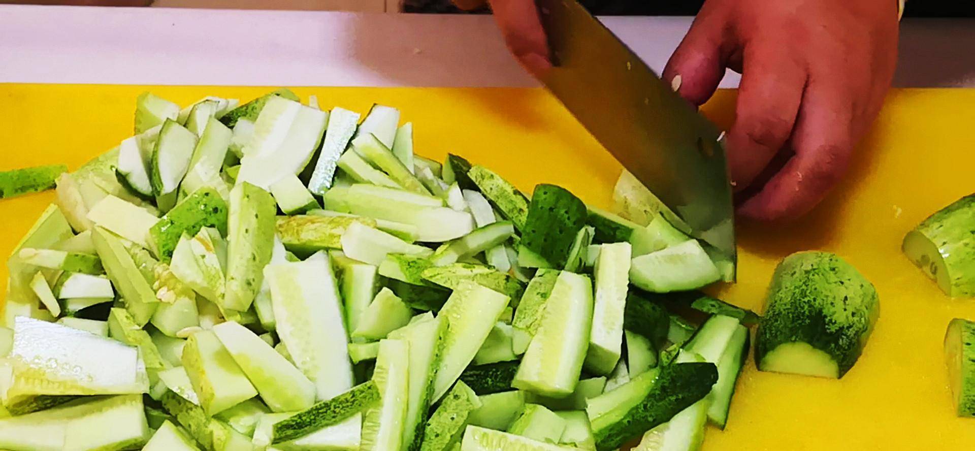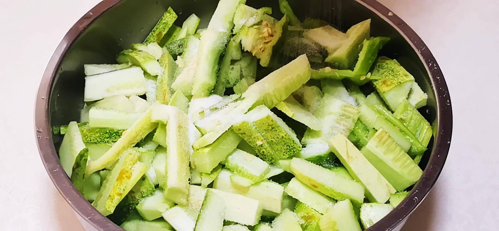 4、2小时后,再把黄瓜里面的水分剂干,放入盖帘上控干黄瓜表面的水分。(注意,腌制后的黄瓜一定要控干黄瓜表面的水分,这样储存黄瓜的时间更长,还不容易新)。