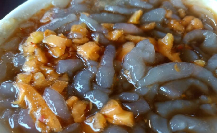 店名虽叫手工面皮店,但除了招牌面皮之外,店内菜品也是很多,各种面食、盖饭、小菜、粥类、炸鸡等应有尽有。其中他家还能吃到蛙鱼,可能不少外地小伙伴第一次看到以为是一种和鱼或者青蛙有关的美食,其实不然,这蛙鱼和鱼、青蛙没有一点关系,它是山芋粉制作而成的一种小吃,既不是鱼也不是青蛙,说白了就是和咱们平时所吃的凉粉差不多,只是叫法与做法不同而已,只是形状酷似蝌蚪,故此称为“蛙鱼”。他家店蛙鱼还可以,加入醋、酱油、蒜泥等佐料,吃起来入口爽滑、香酸可口,味道相当不错,还是值得一尝的。