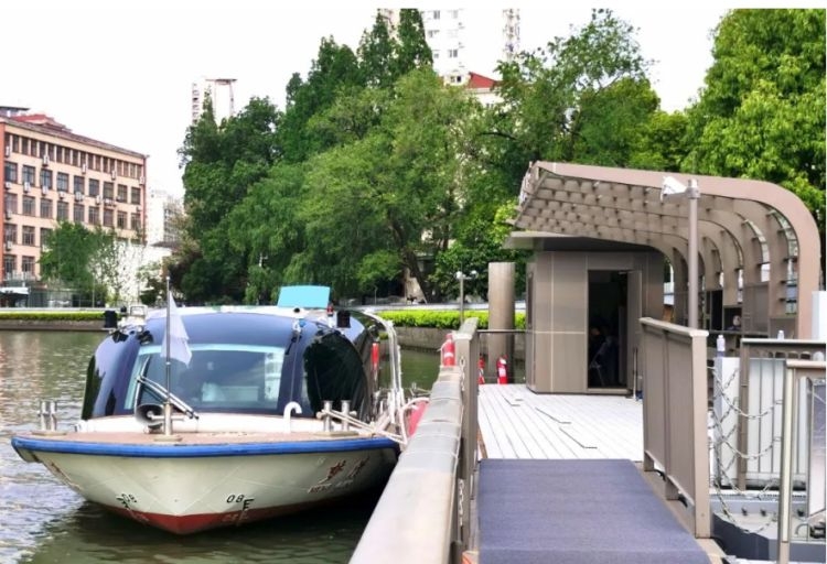 中山公园码头采用的是趸船结构,乘坐游船的市民可从陆域沿河步道通过钢引桥到达趸船,趸船上的布置就如同一座水面上的候车站,安检、站务用房、候船休息座椅、遮阳顶棚、救生圈等设施一应俱全,保障着其中两个游船泊位安全有序运行。