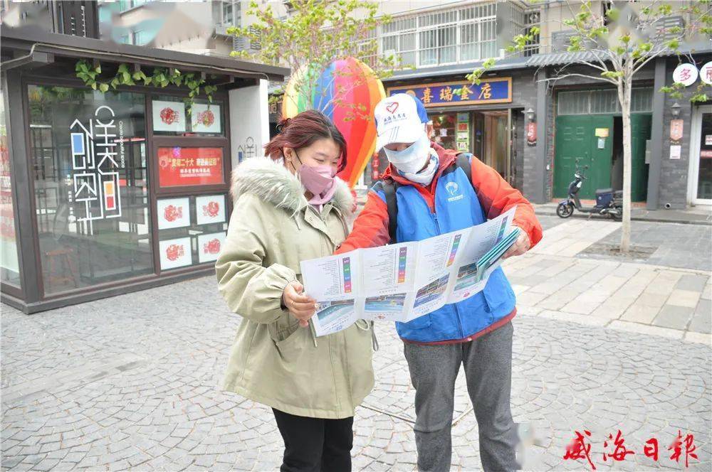 “您好,这是威海旅游导览图,威海主要景点这里都有标注,您不知道去哪玩可以看看这个。”4月30日上午,环翠区鲸园街道的志愿者孙纬坤一大早便来到属相街,为游客发放旅游导览图,提供线路问询等服务。