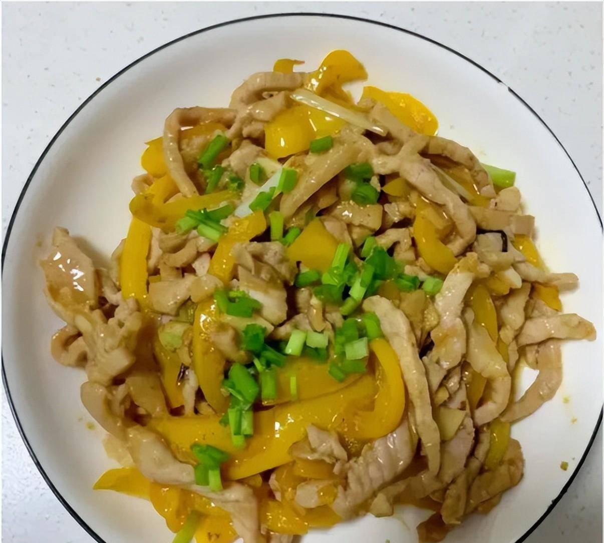 然后有个辣椒炒肉丝,家里没有青椒,张婆婆一边回忆自己老家种好的新鲜辣椒,一边只能翻找了一个黄椒来炒,黄椒比较肥厚,而且没有什么辣度,但是营养丰富,配肉丝也是不错的选择,但是对于张婆婆而言,没有什么气质,只是做给儿子儿媳妇吃的。