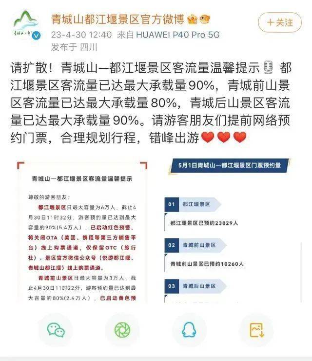 四川都江堰景区的消息称,截至11时32分,都江堰客流量已达最大承载量的90%(5.4万人),已启动红色预警,将关闭在线旅游平台的购票通道,仅保留旅行社、景区官方微信公众号的线上购票通道。截至10时30分,青城山后山景区达最大承载量的90%(1.35万人),已启动红色预警,将关闭所有线上购票通道。截至11时22分,青城山前山景区达最大承载量的80%(2.4万人),已启动黄色预警,将关闭在线旅游平台的购票通道,仅保留旅行社、景区官方微信公众号的线上购票通道。