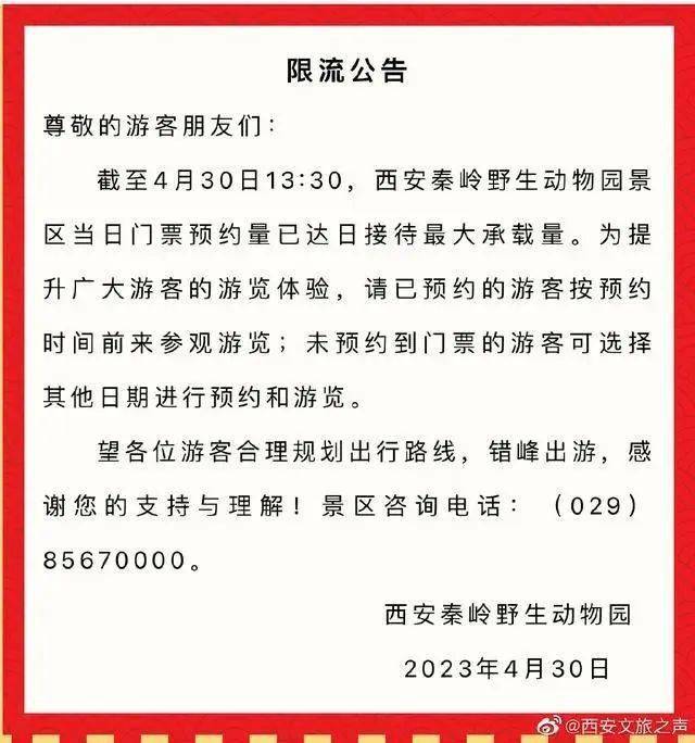 西安秦岭野生动物园发布停票限流的公告:截至4月30日13:30,西安秦岭野生动物园景区当日门票预约量已达日接待最大承载量。为提升广大游客的游览体验,请已预约的游客按预约时间前来参观游览;未预约到门票的游客可选择其他日期进行预约和游览。