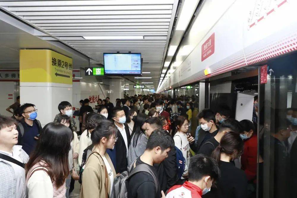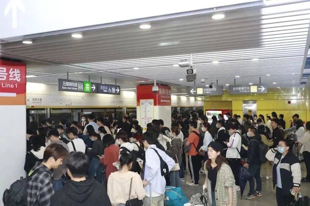 五一假期,各景区和商圈活动相继开启,市民出行游玩、外出消费、踏青春游意愿强烈,毗邻高校、商圈、交通枢纽车站人头攒动、摩肩接踵、熙熙攘攘。当日, 1号线客运量 80.520万人次(历史最高74.45万人次), 2号线客运量 45.965万人次(历史最高49.77万人次), 3号线客运量 34.394万人次(历史最高35.21万人次), 4号线客运量 29.223万人次(历史最高26.97万人次),其中 1号线和4号线客运量 创新高;线网累计开行列车1518列次,加开列车39列次,列车正点率达100%,运行图兑现率达100%。