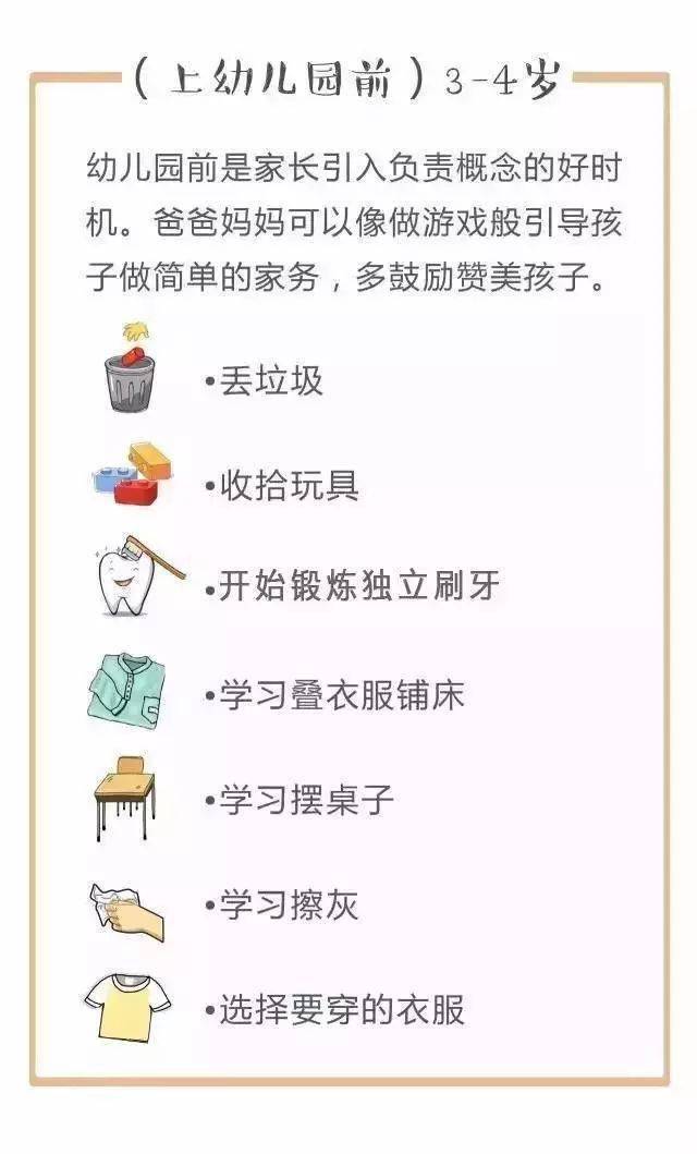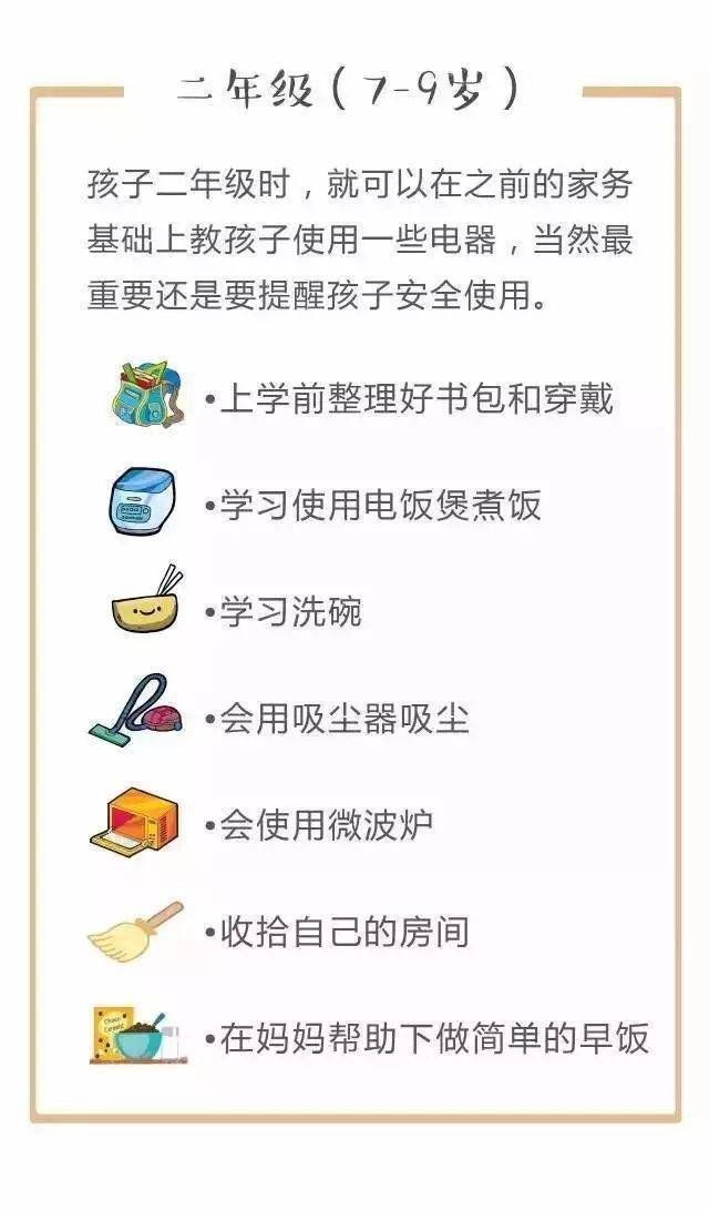 对照下面的家务年龄表,父母可以更好地把握什么年龄的孩子该做哪些家务。