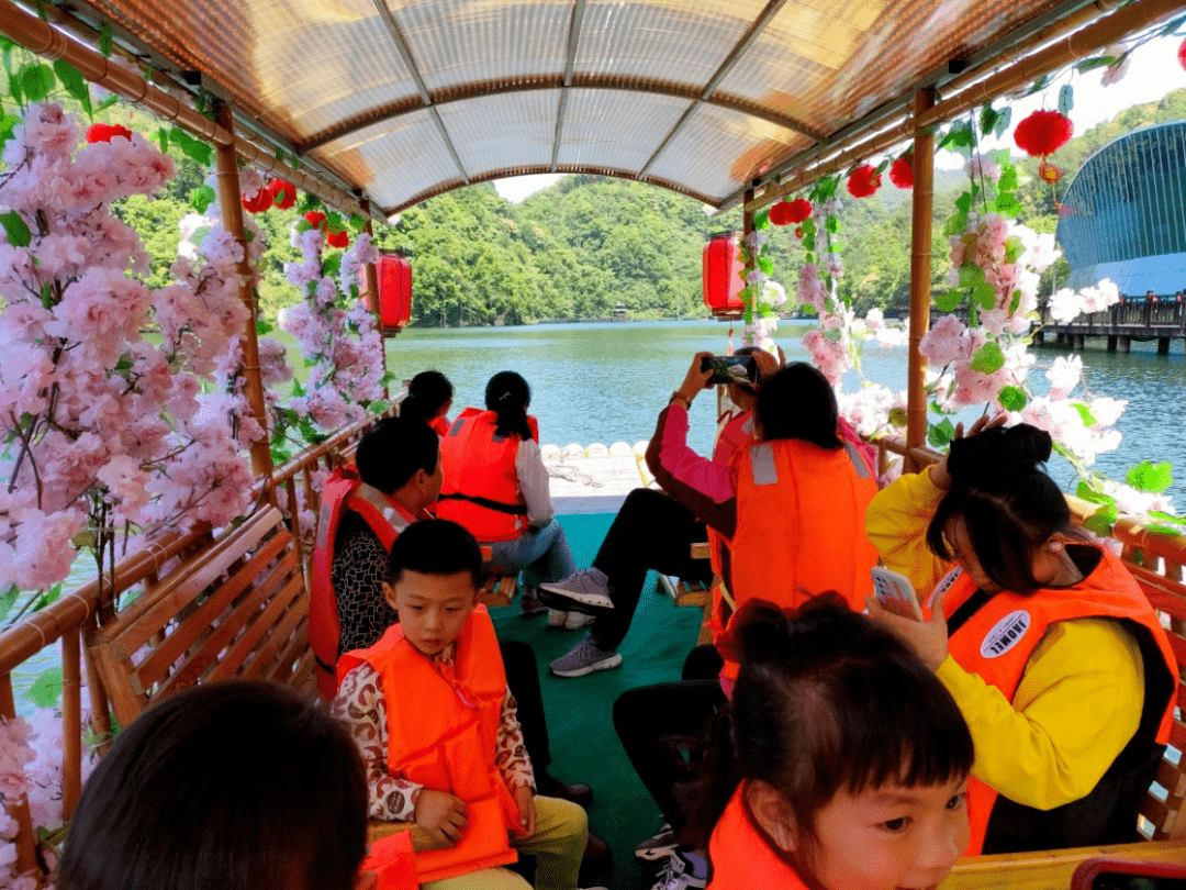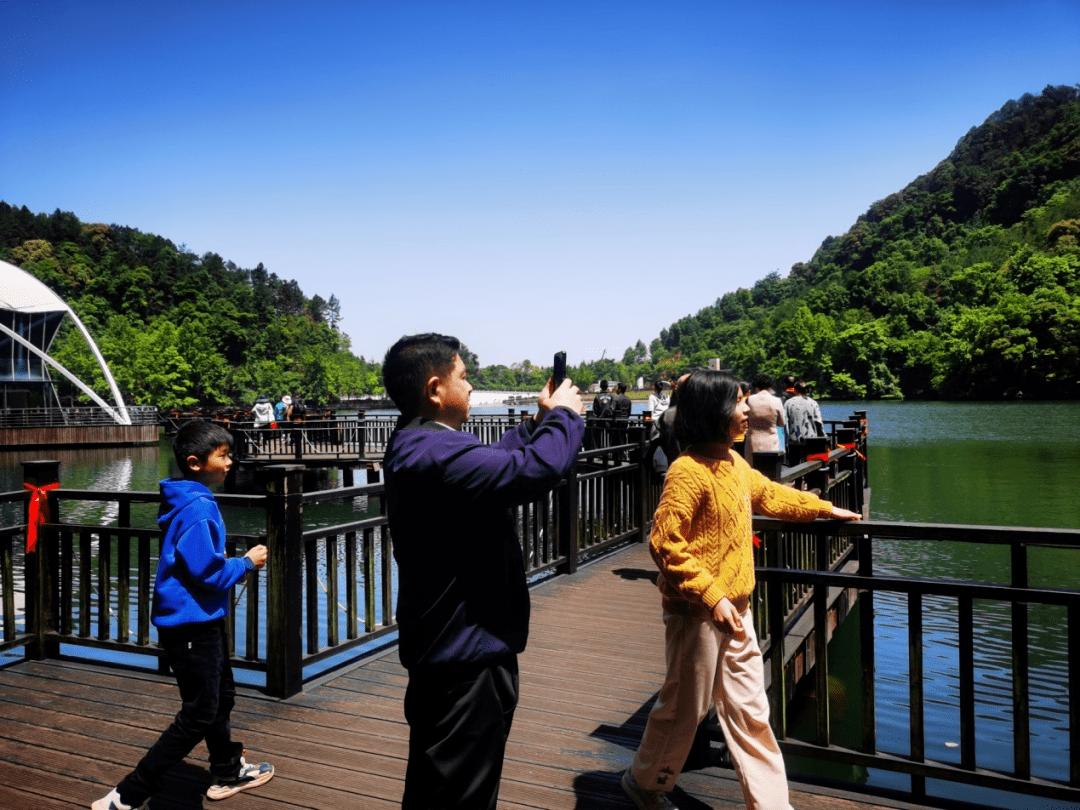 小阳明湖一湖秀水,两岸青山。游客们遵守景区各项规定,穿好救生衣排队上船,他们泛舟湖内,或谈笑、或自拍、或分享,好不惬意。湖畔游人如织,大家都陶醉在这山水画卷之中。