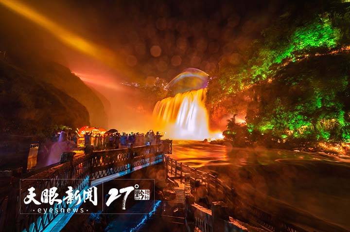 游客观赏黄果树瀑布夜景。陈熙 摄(贵州图片库发)