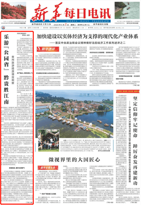 2023年5月2日,《新华每日电讯》头版推出文章《乐游“公园省” 黔贵胜江南 贵州旅游提质增效观察》,聚焦正在建设世界级旅游目的地的贵州,随着旅游业逐步复苏,大开迎客之门,聚焦旅游资源、客源、服务三方面发力,推动多产融合、数据赋能、服务升级,让旅游产业化不断实现新突破、绘出新图景。具体报道如下:
