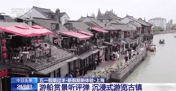 在上海,不少游客来到青浦区的古镇朱家角,感受江南的水乡风情。4月30日8点至19点,朱家角已经接待了超5万人次的游客,5月1日景区人气依然不减。