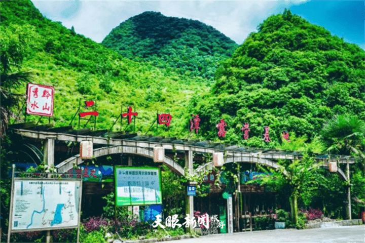 二十四潭户外露营基地位于黔山秀水景区内,露营地依山傍水,风景秀丽,帐篷隐藏在青山绿水之间,富有诗意,满山郁郁葱葱的树木,可以肆意呼吸。