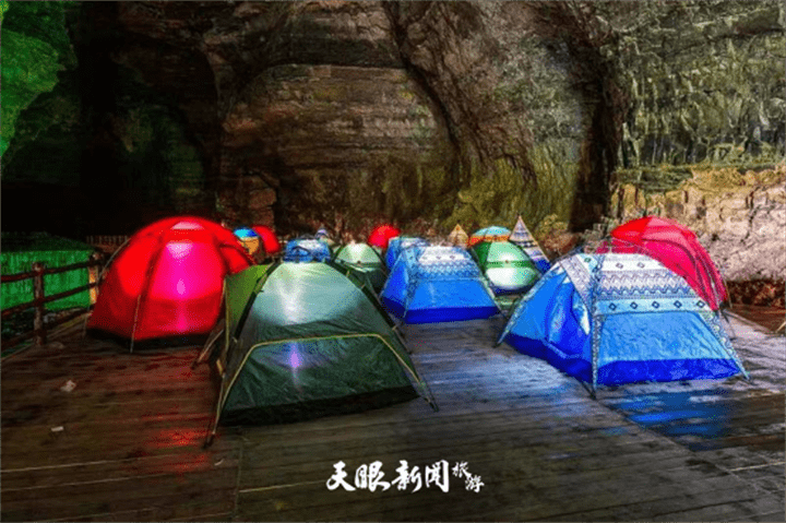 “十二背后”有国内首个对外开放的洞穴宿营地,可在洞穴内帐篷扎营,体验洞穴生活,倾听地球的变迁,还可以体验竖井绳降等项目。