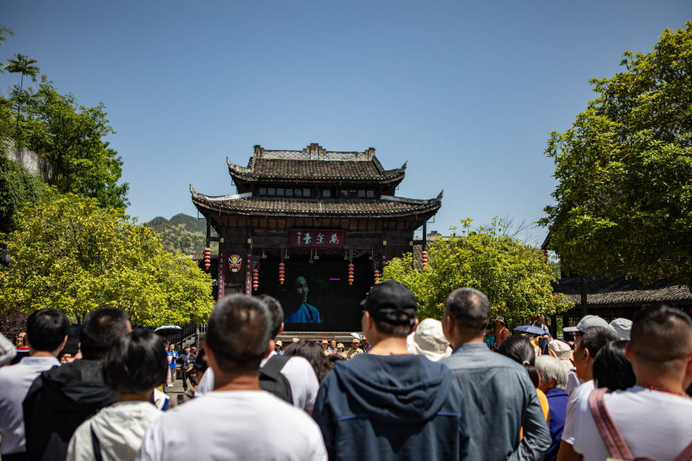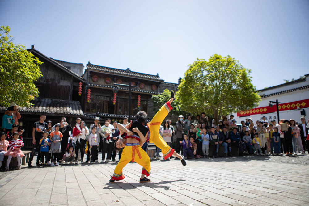 ▲2023年4月30日,秀山县洪安古镇老街,游客在观看民间杂技艺术表演。