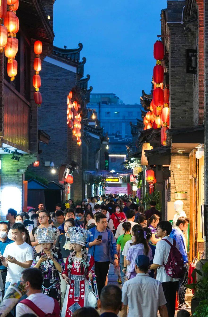 5月1日傍晚,东西巷历史文化街区华灯初上,夜色中的正阳门下汇集了来自全国各地的游客,城门外美食街、商业街更是人头攒动,热闹非凡。“五一”假期虽已过半,但桂林旅游热度不减。 记者何平江 摄