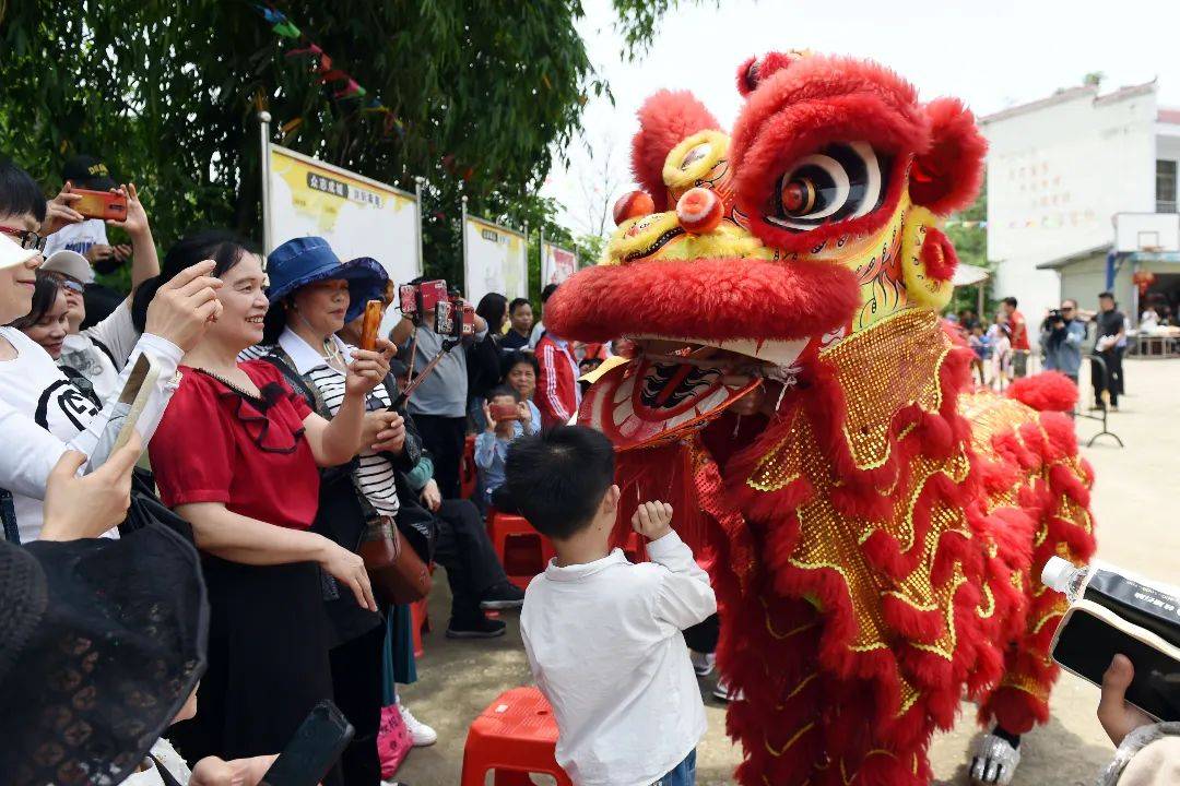 “五一”假期,临桂区会仙镇沐宦头村开展了舞狮、大人摸鱼、传统磨豆腐等丰富多彩的民俗活动,吸引了众多游客前来参观体验。图为舞狮与游客互动。记者李忠波 通讯员石承琼 摄