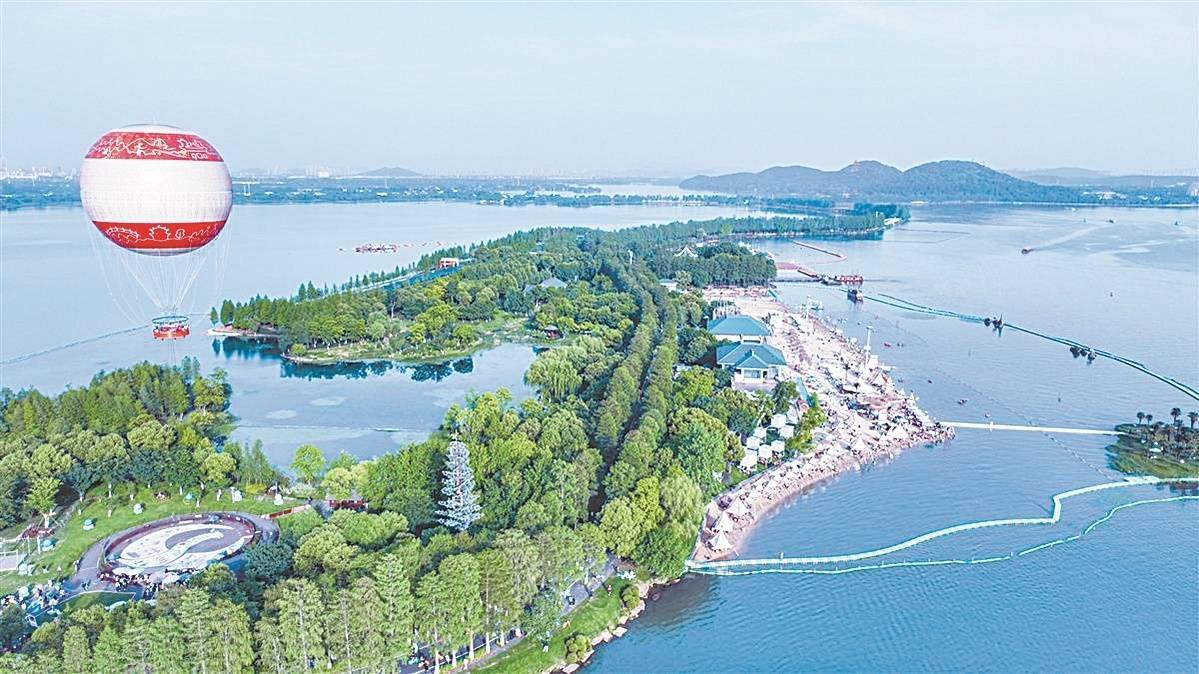 东湖沙滩市场部负责人肖佩介绍,这个湖中央的小岛是于近日开放的湖心岛,游客能登岛眺望城市,临水赏一线落日。此外,小岛作为一个天然的舞台,将不定时举办乐队氛围演出,让游玩乐趣加倍。