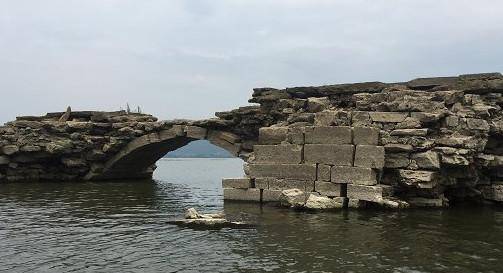 但是,自从1958年截江蓄水改建水库,桥与古城一并淹没于水中。而到了70年代,为了水道通航,人们用炸药把偶浮出水面的桥身炸成两段,数百年风雨不侵的“万年桥”遂成断桥。