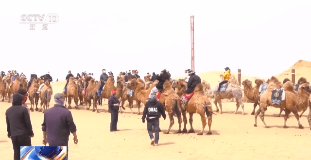 在鄂尔多斯市响沙湾景区,游客们在骆驼背上悠然骑行,感受着雄浑壮丽的大漠风光。