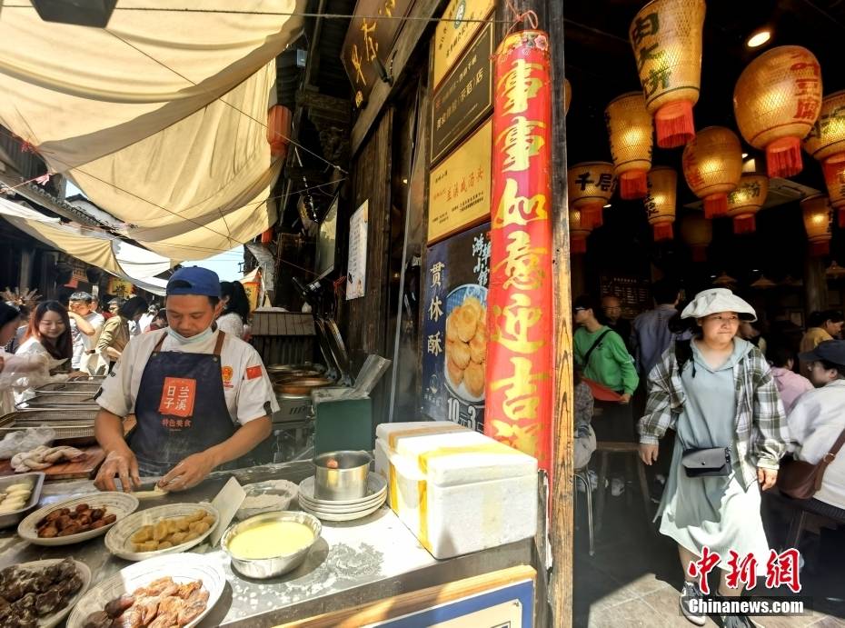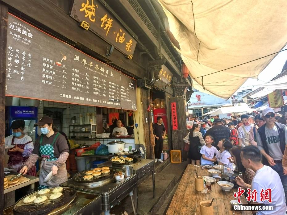 5月1日,“五一”假期,浙江省兰溪游埠古镇迎来客流高峰,景区人潮涌动,游客纷至沓来。图为游客在早茶街品尝“打卡”。中新社记者 赵隽 摄
