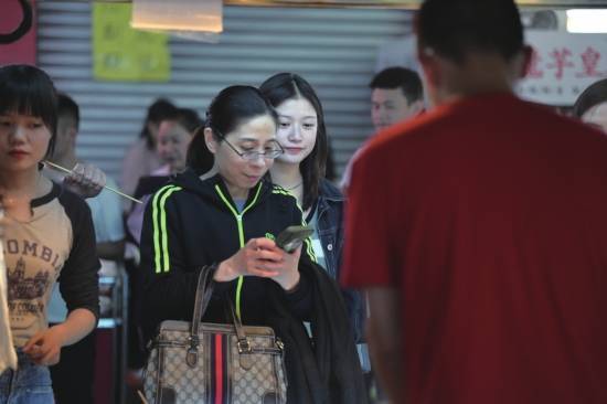 (4月30日,四方坪夜市里,游客通过手机购物。)