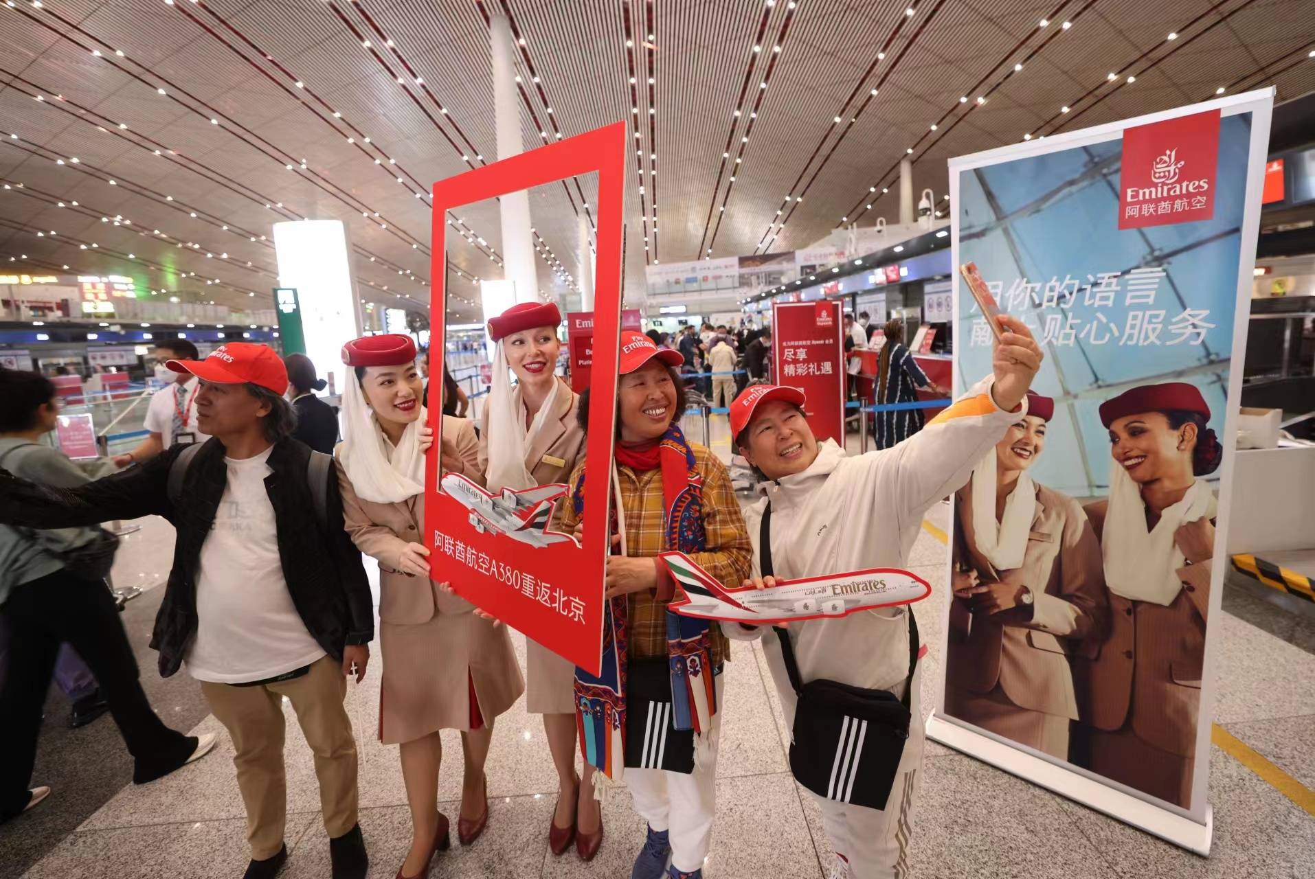 旅客们与阿联酋航空空乘人员合影。新京报记者 陶冉 摄