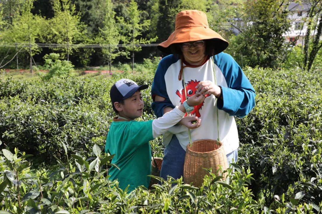 白马山天尺情缘景区茶园里游客体验采茶的乐趣。