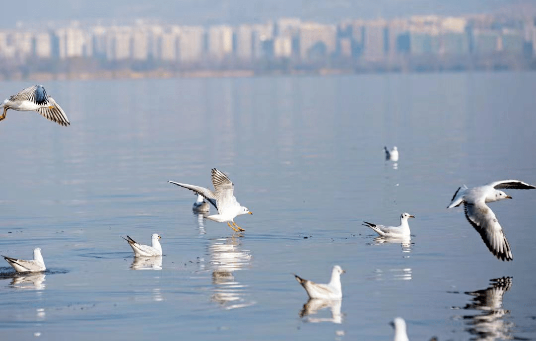 邛海边云悠悠、水潋滟,芳草碧连天,凉爽的微风带起海面一片涟漪,海面上鱼鸟戏游,岸边游客尽情嬉戏、拍照留念。