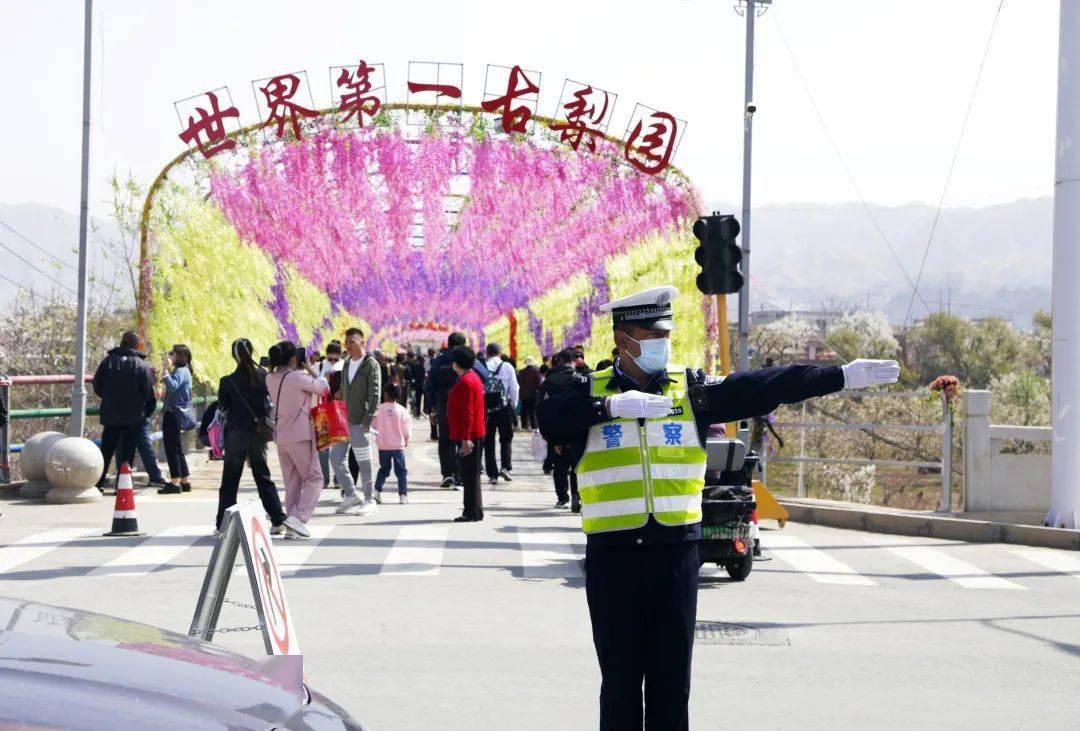 在兰州市皋兰县,2023年“梨韵什川”梨花会也如期开幕,八方游客闻名而来,踏青赏花,体验大自然带来的惬意。皋兰县公安局聚焦阶段性治安管理难题,深化“旅游警务”机制,紧密围绕“多元共处、安全有序”目标,对各执勤点定人、定岗、定责,积极构建点线面结合、防控巡一体的立体化社会治安防控体系,“全视角”动态守护景区安全。