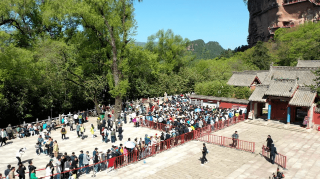 “五一”小长假是疫情防控政策调整后的第一个旅游高峰,各大景区旅客激增。国家5A级旅游景区麦积山石窟是众多外地游客的首选之地,5月1日上午十点,麦积山景区门票预约量已达上限。麦积山大景区管委会采取分流疏导措施,通过网站、微信、抖音、景区电子屏、公告栏等渠道,及时向社会各界发布了停止售票的公告,引导游客有序游览、错峰游览。伏羲庙景区上午九点开始,游客已经络绎不绝。与之毗邻的天水古城游客如织,兴夤夜方酣。青鹃山国际旅游度假区连日来人潮涌动,青鹃山童话小镇游乐场上人声鼎沸,孩子们玩得不亦乐乎。5月1日CCTV13《朝闻天下》节目,《暖心服务贴心管理 让游客玩得开心又放心》栏目,播出麦积山景区旅游情况视频,持续时长约1分钟。