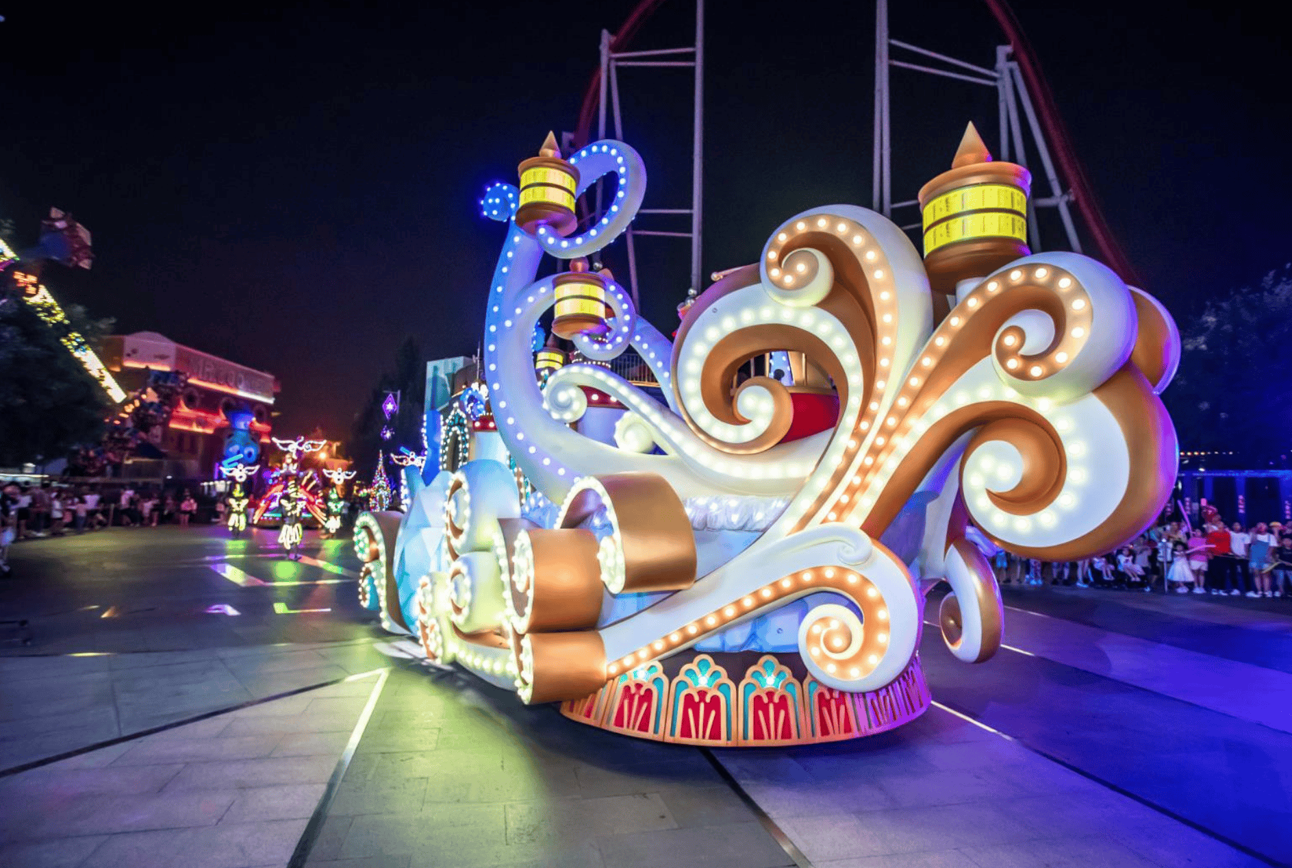 《燕子李三》特技实景剧、《梦之光》夜光巡游、《盖世英雄》城市空间互娱装置体验秀、《玩宠归来》万千星光狂欢幻影秀……一场场夜间表演让游客们流连忘返。观众不仅能听到表演声,远处乘坐过山车游客的尖叫声不时传来。景区在夜晚开放30余项娱乐设施,音乐过山车1200米的两侧轨道到了晚上会被2万多个LED灯点亮,灯光随过山车运行而变换色彩。
