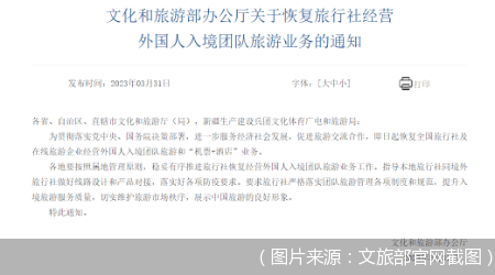 3月31日,文旅部办公厅印发《关于恢复旅行社经营外国人入境团队旅游业务的通知》(以下简称《通知》),其中明确,即日起恢复全国旅行社及在线旅游企业经营外国人入境团队旅游和“机票+酒店”业务。消息一出,再次利好入境游。各旅游企业接连上新入境游产品。从目前市场看,受供应链、人才等因素的影响,入境游市场完全恢复仍需要一段时间。