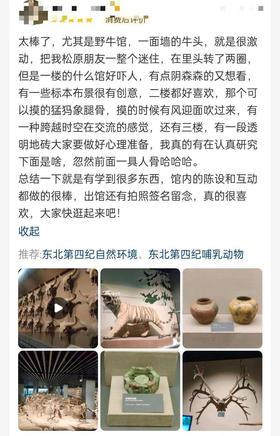 太棒了,尤其是野牛馆,一面墙的牛头,很激动,把我松原朋友一整个迷住,在里头转了两圈……有一些标本布景很有创意,二楼都好喜欢,那个可以摸的猛犸象腿骨,摸的时候有风迎面吹过来,有一种跨越时空在交流的感觉。还有三楼,有一段透明地砖大家要做好心理准备,我真的有在认真研究下面是啥……
