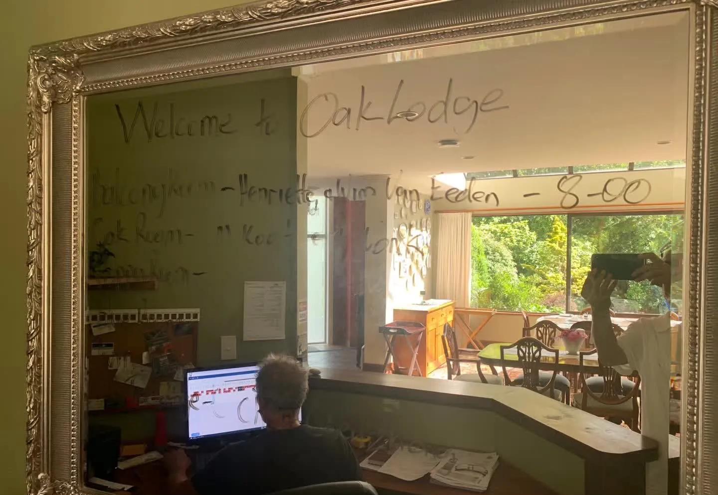 酒店服务台玻璃窗上写着当时疫情方面的一些提醒