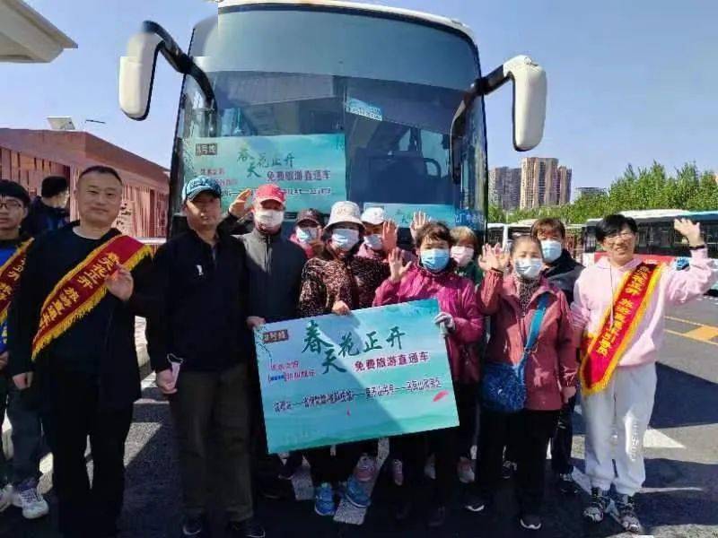 旅游直通车2号线已准备就绪,车组人员身披喜庆的文旅宣传绸带、手举印有“春天花正开 免费旅游直通车”旅游线路的宣传牌,笑意盈盈地守候在车下。
