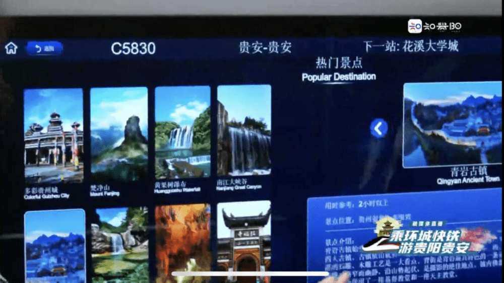 本次直播乘坐的C5830次列车,早上9时20分从贵安站出发,途经花溪大学城、花溪南、贵阳站,10时16分到达贵阳北站,全程大约1个小时。沿线分布美景美食,串联起红枫湖、万亩樱花园、月亮湖、星月湖、云漫湖、天河潭、夜郎谷、花溪公园、十里河滩、花溪十字街、青岩古镇、青云市集、黔灵山公园、甲秀楼等10多个景点。