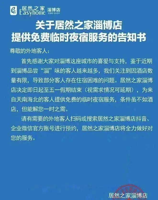 因为五一期间淄博酒店数量有限,有部分游客存在住宿困难情况,淄博某家具城提供免费的临时住宿,直到五一结束,还是需求可延期;影院免费提供厅内过夜休息服务,游客可以在最后一场电影结束后免费休息到早上七点,还特地为特种兵准备了超低价深夜场。