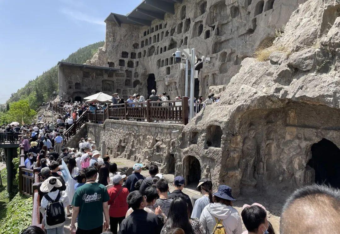 ▲ 2023年4月29日,河南洛阳,五一假期首日,龙门石窟风景区游客络绎不绝,景区参观甬道上挤满游客。图 / 视觉中国