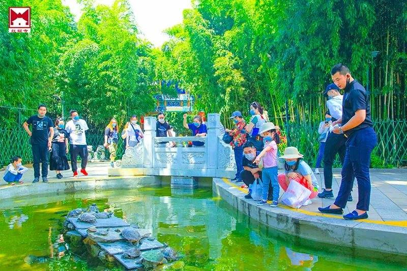 寺前放生池中有许多观赏鱼类和小乌龟,景区提醒游客文明游玩观赏。