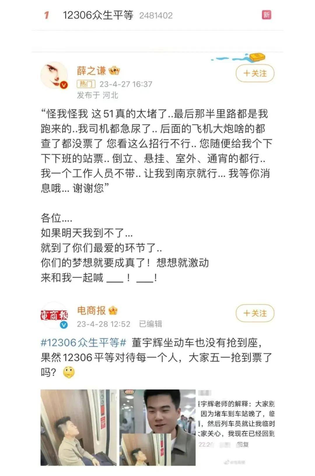 28日午间,微博话题“12306众生平等”冲上热搜一位。前有薛之谦抢不到票差点错过自己的演唱会,后有董宇辉坐动车也没抢到座。网友纷纷表示,“今年‘五一’,大家是平等地抢不到票”“无座票都能抢完”“这‘五一’感觉比春运都热闹”。