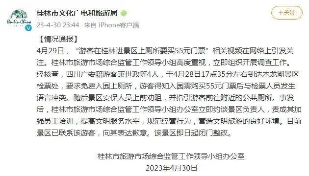 就昨天游客声讨55元上厕所视频,大家议点纷纷,没有一边倒,意见并不统一。今天桂林市的旅游主管部门“桂林市旅游市场综合监管工作领导小组办公室”的处理决定出来了,我看了下这个处理决定,总体感觉是,有点官僚,不管有理没理,先自打一板本身值得商榷,而且板子的落点也有问题,要求景区改进服务态度没问题,但板子的落点应该在桂林市旅游管理部门自身。