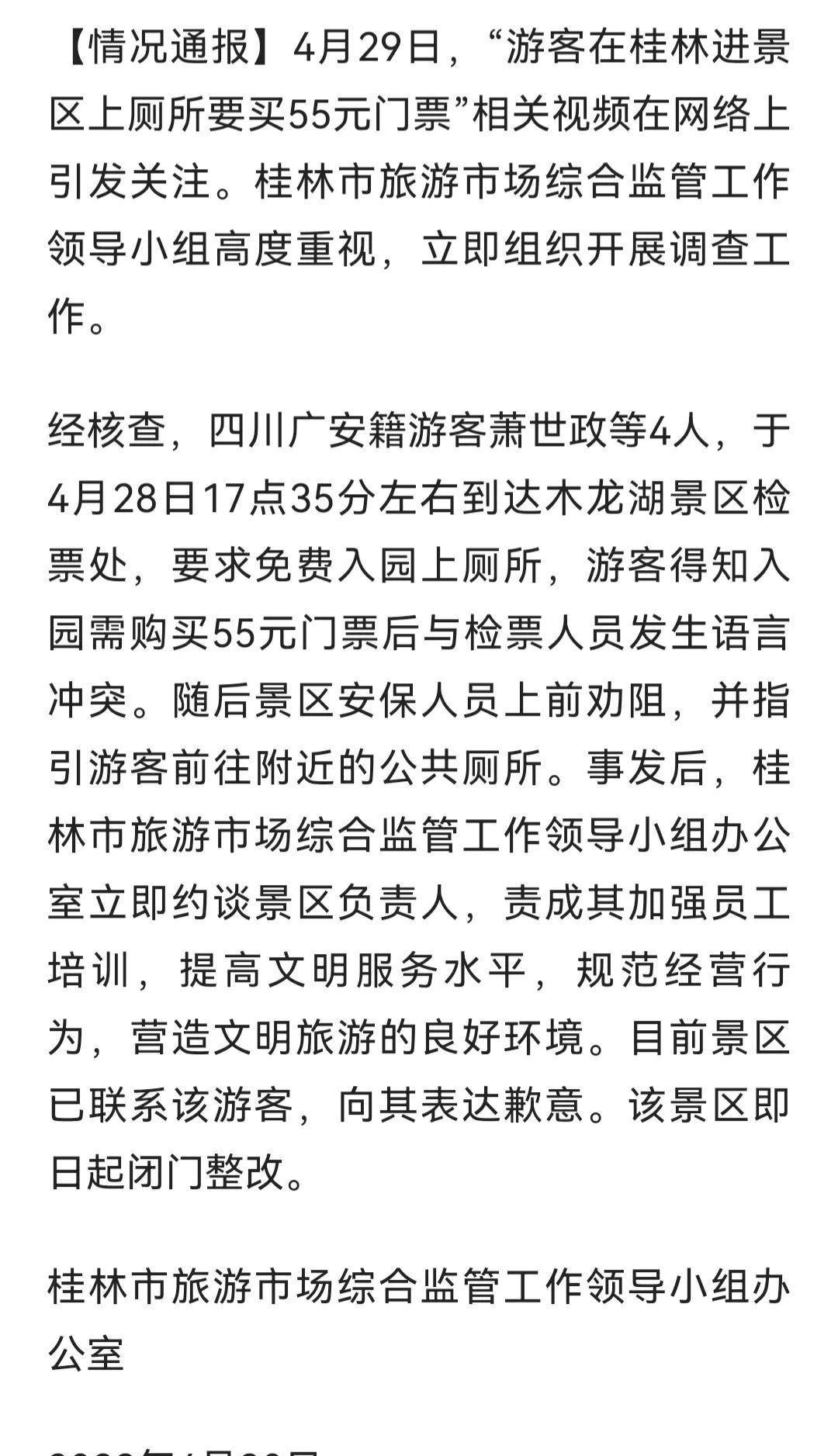 4月29日,“游客在桂林进景区上厕所要买55元门票”的相关视频在网络上引发广大网友的关注。