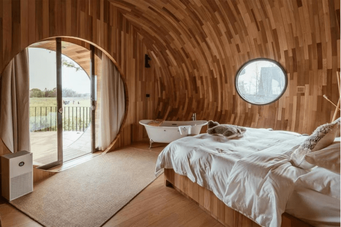 木屋营地规划一定要存在创意,以美国纽约的旋转森林小屋为例,我们把它看作是隐藏在森林中的不明飞行物或冰屋,有一个圆形的形状,一半在小房间下面,小屋可以悬浮在森林里,就好像穿越时空一样。
